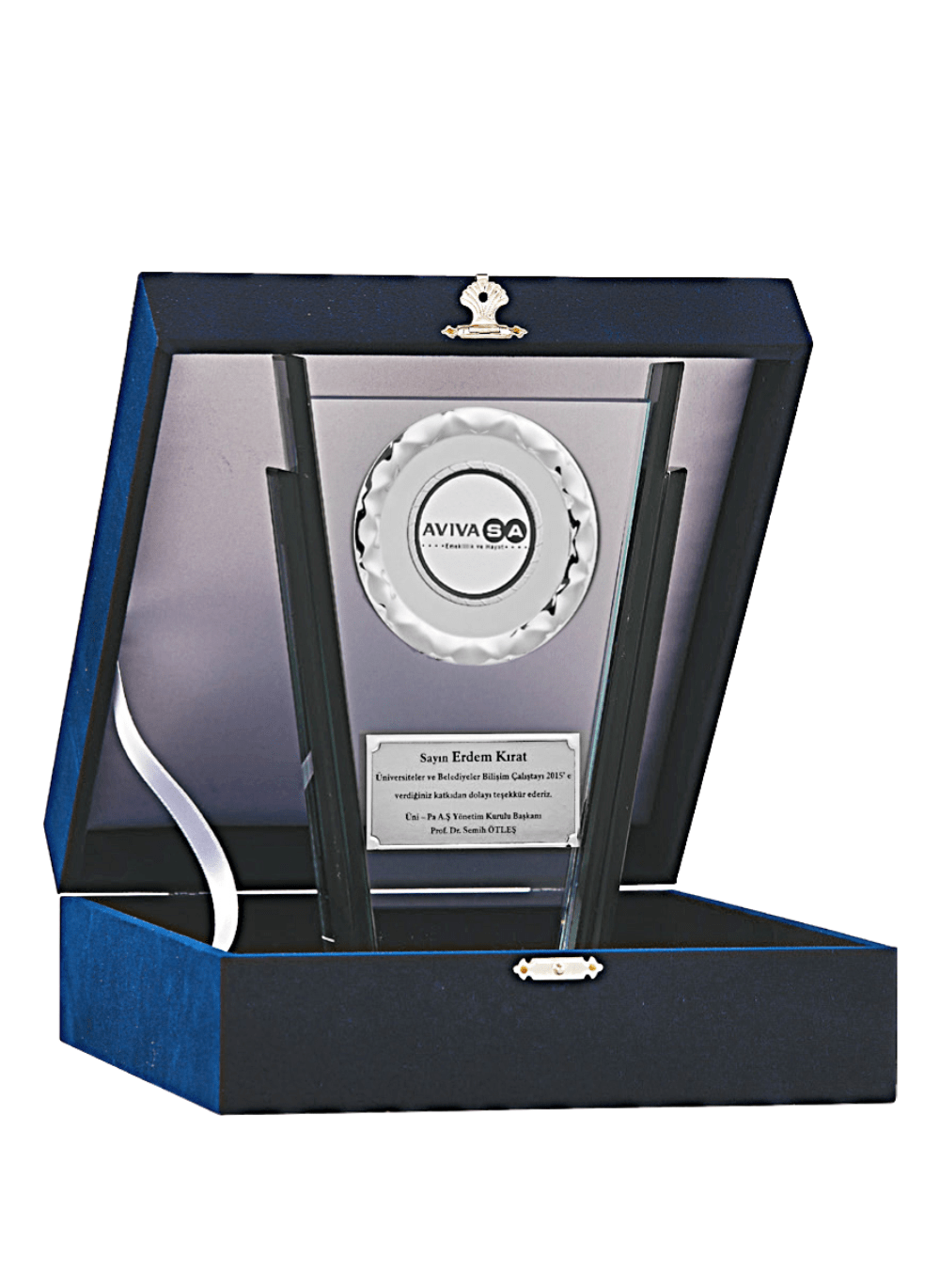Bu plaketimiz, Kadife kutulu 23x16 cm ölçüsünde, yan kısım füme renkli, ön kısım ise şeffaf renkli kristal clear camdır. Alt basamak kaidesi bronz kesim kristal camdır. Etrafı desenli kabartma gümüş renkli logo alanı 4.5 cm ve alt yazı alanı olan kristal cam plakettir.